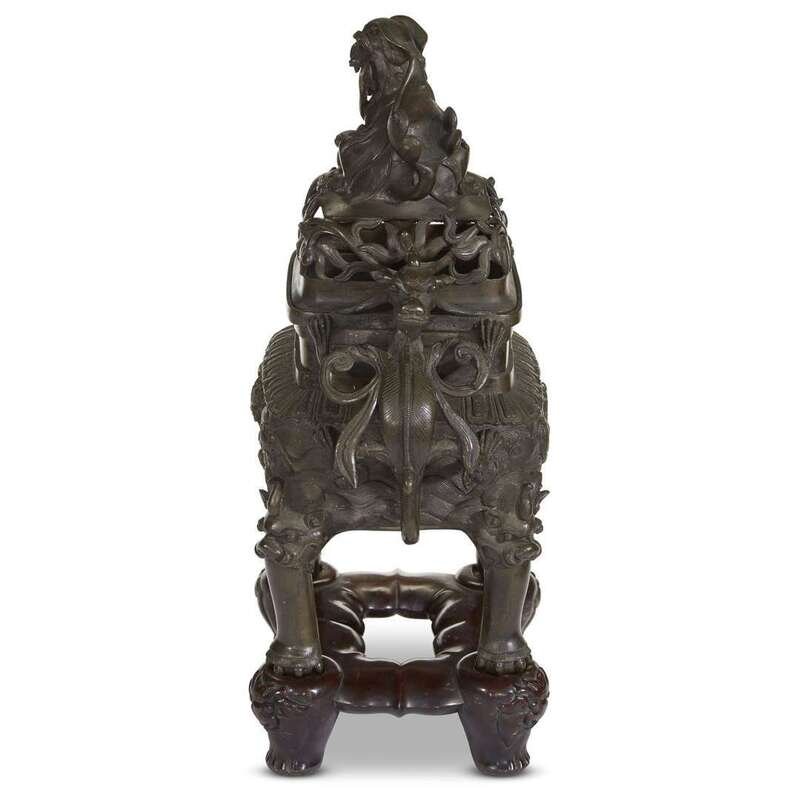 With qilong handles, the body modeled with various creatures on the sea, beast-headed knees, on wood stand with taotie masks at the knees.
