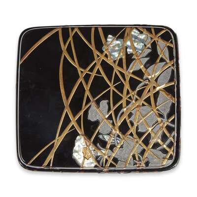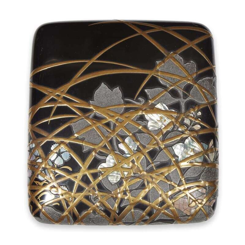 A Japanese Rimpa style pewter and mother-of pearl-inlaid lacquer box and cover