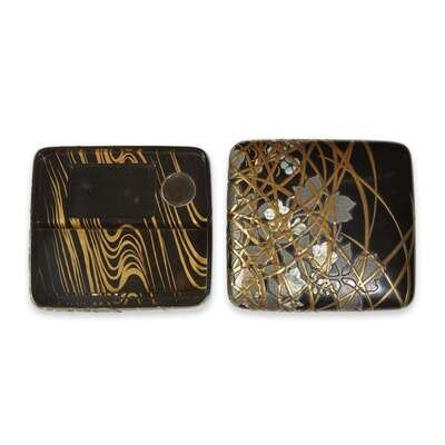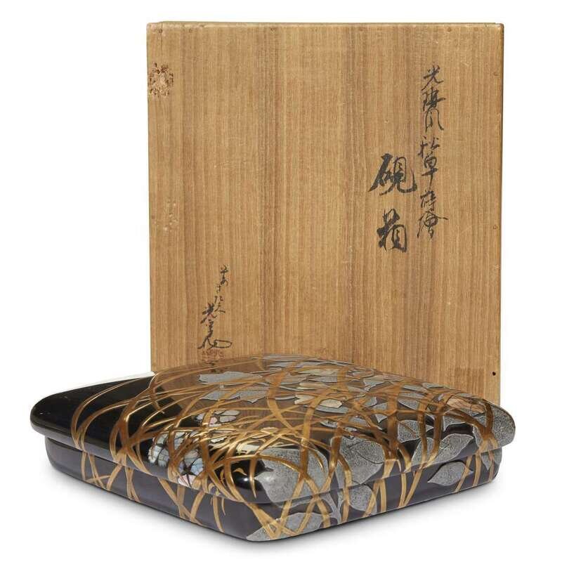 Depicting flowers and autumn grasses, rounded covers and sides, fitted interior with stylized water currents; inscribed Japanese wood box, after Korin, with artist's name Kosetsu.