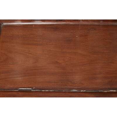Of a dense reddish-brown finely-grained timber, the scroll-back centered by two panels, the upper panel carved with angular scrollwork, over rectangular paneled seat with molded edge, pierced scroll skirt to front, beaded skirt to sides, all on square legs, scroll feet.