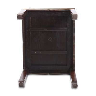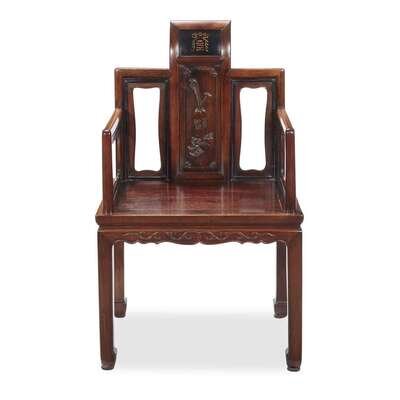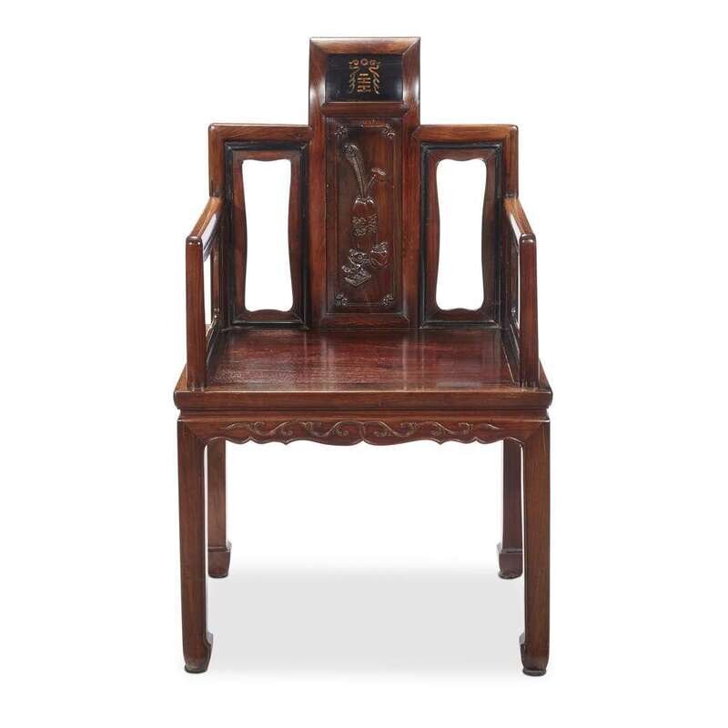 The splat inlaid with a character, a carving below of a vase with ruyi scepter, water coupe, and fu lion seal.