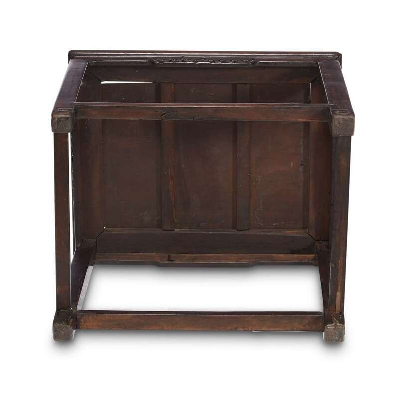 With an ornately carved back depicting a shou symbol and bats over a rectangular seat, raised on square legs with scroll feet, with box stretcher.