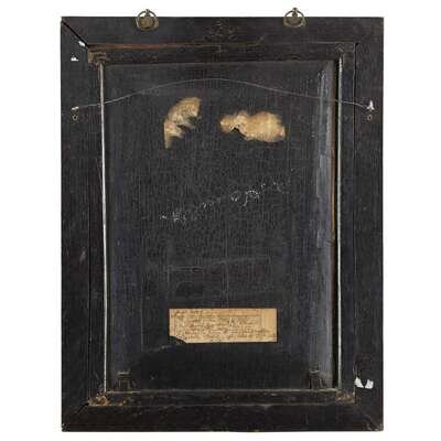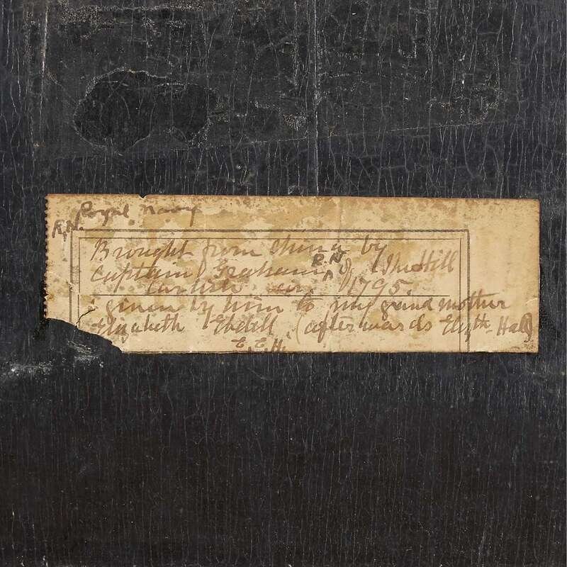 In a Chinese gilt and black lacquer frame, probably original, verso bearing an old lable inscribed "Brought from China by Captain Grabaur, R. N. of ...Hill, Carlisle cir 1795 given by him to my grandmother Elizabeth Ebdell (Afterwards Elizth Hall)"