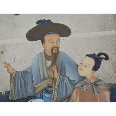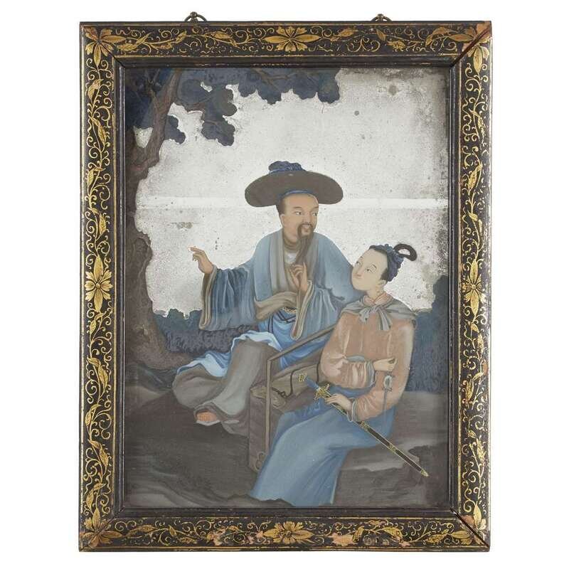 A Chinese export eglomise painting depicted a seated male and meiren with sword late 18th century