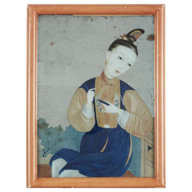 A Chinese export eglomise painting, depicting a seated meiren, 3/4 length 18th/early 19th century