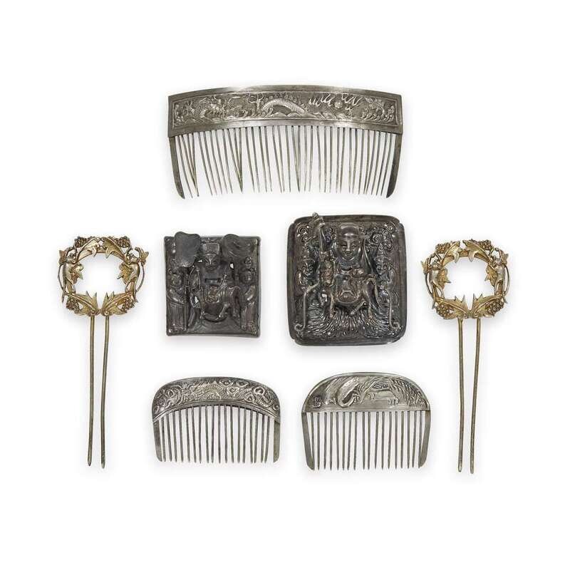 Comprising three combs with maker's marks, two gold-washed hair pins, and two ornaments, larger ornament bearing the maker's mark to back.