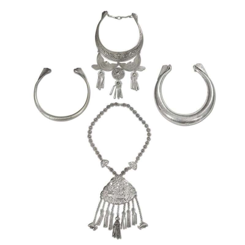 Comprising two torques, a torque with birds and flowers, a necklace with bird, dragonfish, flowers, and floret chain.