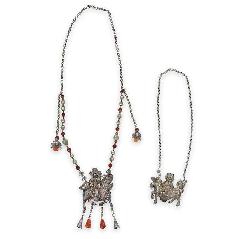 Comprising: A chain and beads with double-gourd flask; chain and beads with figural pendant; kylin and rider pendant with chain; kylin and rider with chain and beads; lock with beads and chain, auspiscious basket with beads and chain.