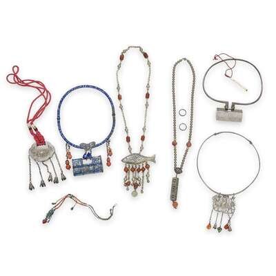 Comprising an enameled "lock" and loop necklace, a silver lock and loop necklace, a kylin pendant and loop necklace, a fish pendant and beaded chain, a pierced hexagonal pendant and glass beads, a silver lock on later cord, an enameled frog and coral bead necklace, and two enamel rings.