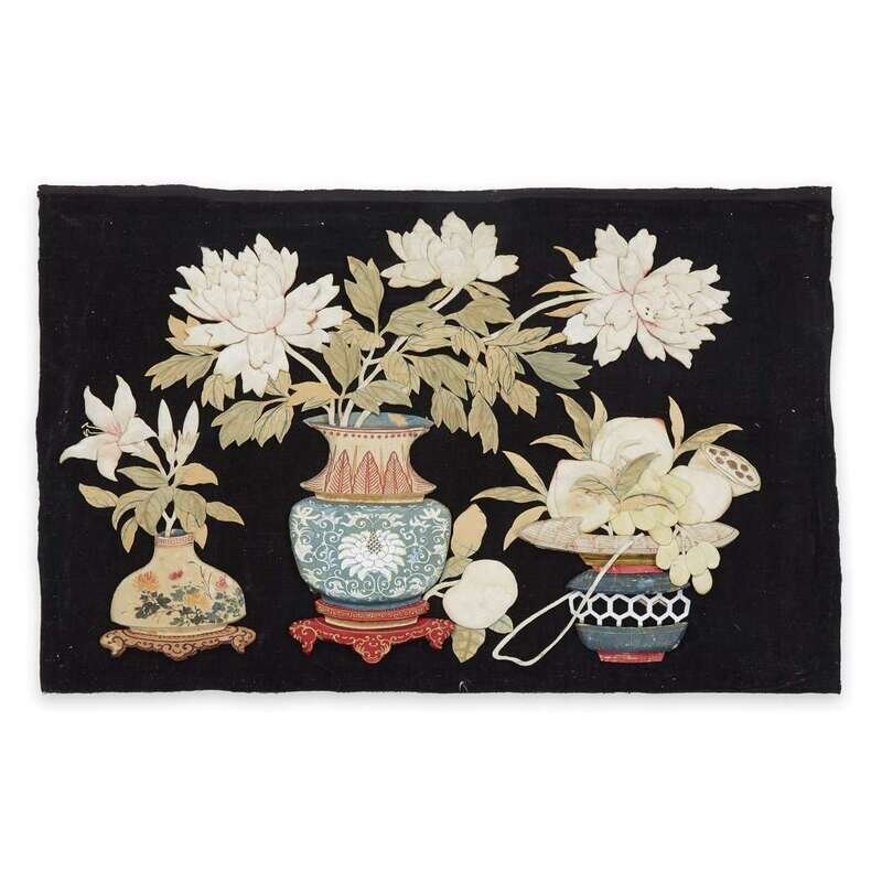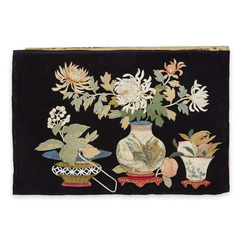 An unusual pair of Chinese modeled textile pictures of "Antiques and Flowers"
