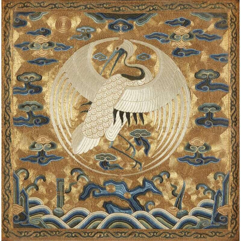 A rare Chinese civil official's embroidered silk "Crane" rank badge kangxi period