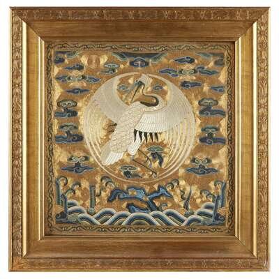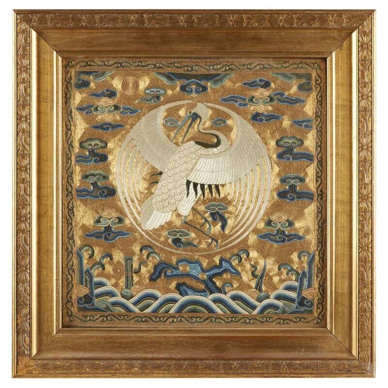 The crane embroidered as a roundel against a gold embroidered ground with ruyi-shaped clouds, above rockwork and waves, all within a scroll border, framed and glazed. NOTE: For a similar badge, divided, see the example sold at Christie's Hong Kong, "The Imperial Sale", May 30th, 2012, Lot 4032.