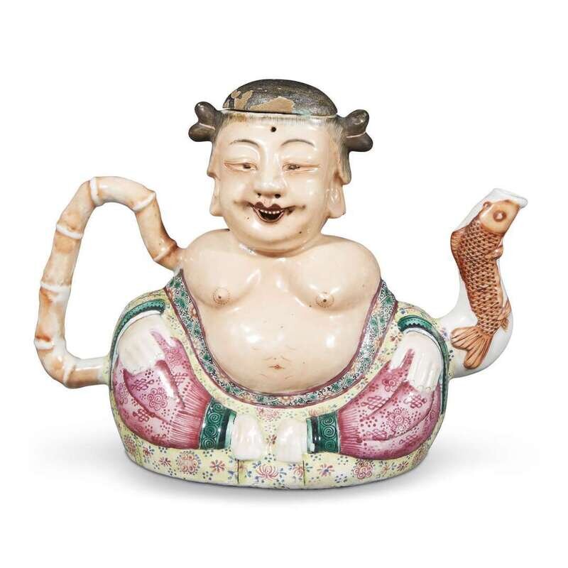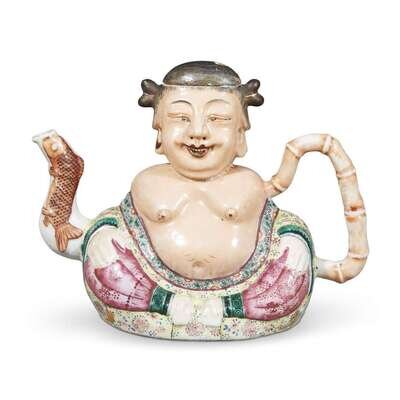 An unusual famille rose-decorated porcelain "Double Budai" teapot 19th century or earlier