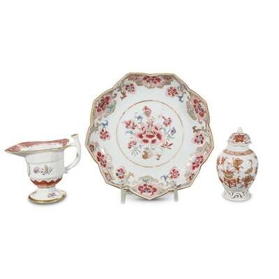Comprising a tea caddy and associated cover, helmet-form creamer with unusual owl crest, and floriform dish.