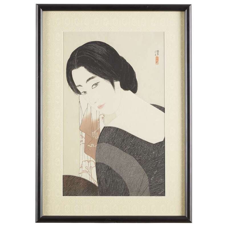 AFTER THE BATH Woodblock print in colors with mica ground, inscribed and with seal to upper right, framed, matted, and glazed.