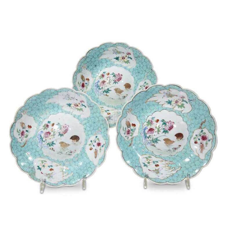 Decorated with quail and peonies, turquoise "cracked ice" ground, leaf and fruit--form reserves with butterflies and flowers, two bearing old Sotheby Parke-Bernet lables.