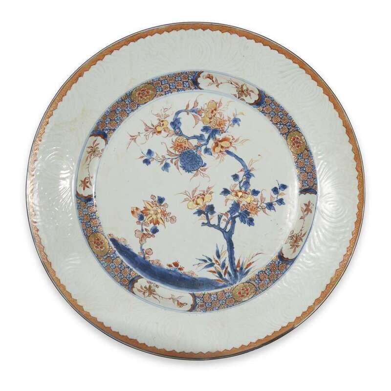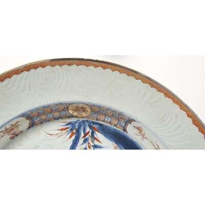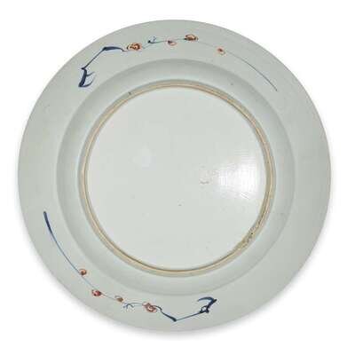 Decorated in "Imari" palate with flowers and pomagranate, stylized lotus and cloud-scroll border.