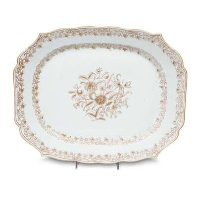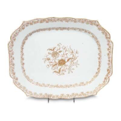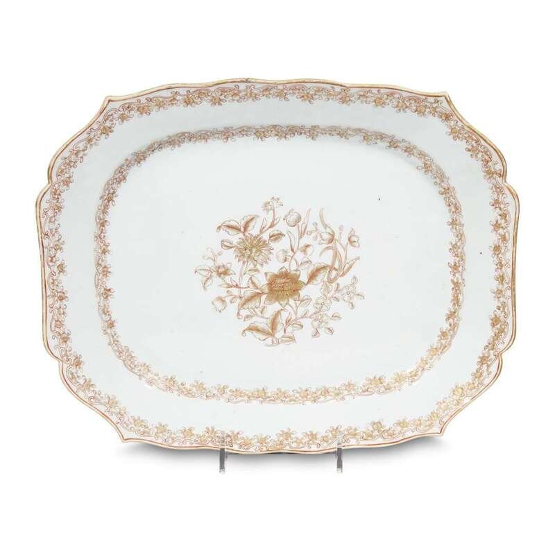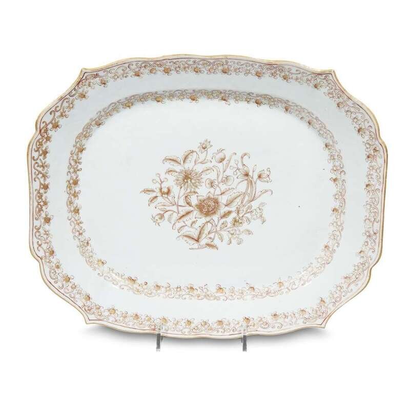 With barbed rims, decorated with iron-red and gilt floral sprays and flower-scroll borders.