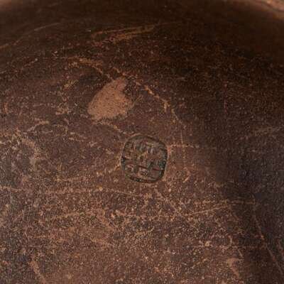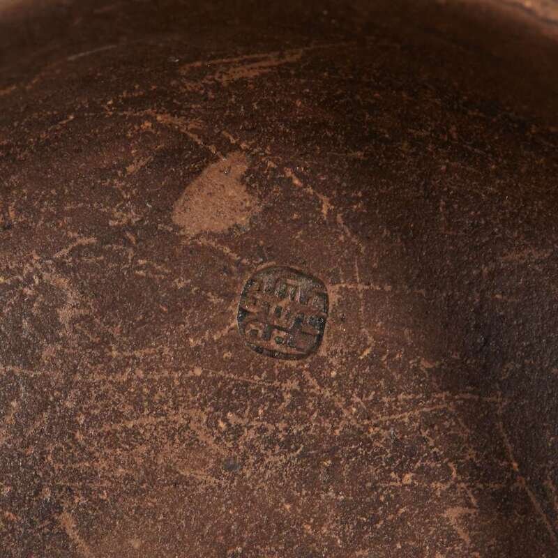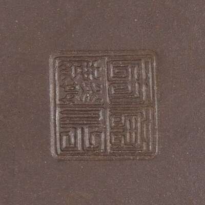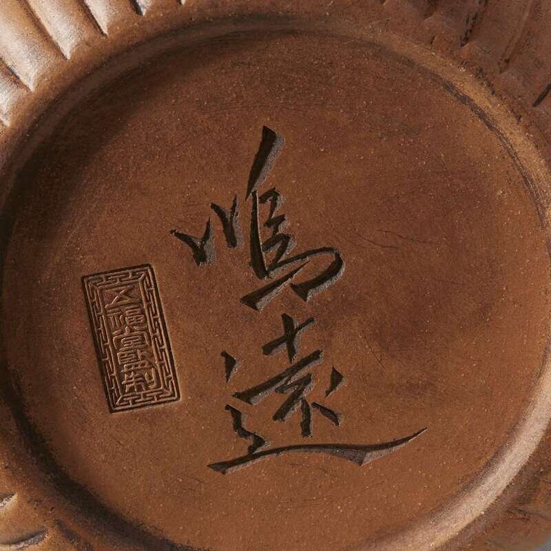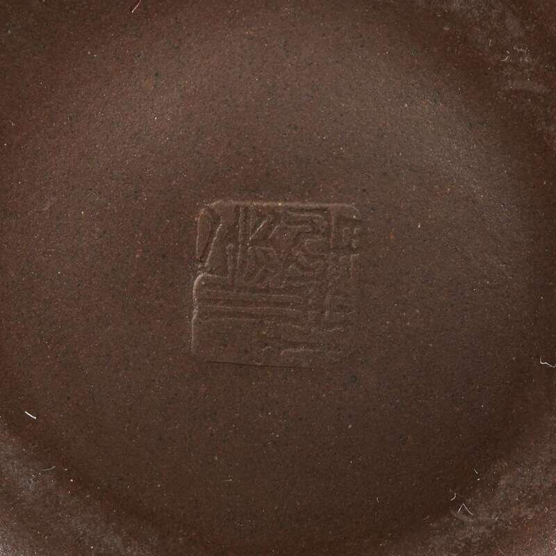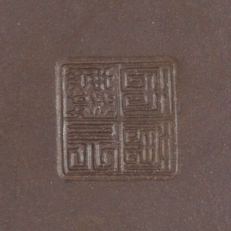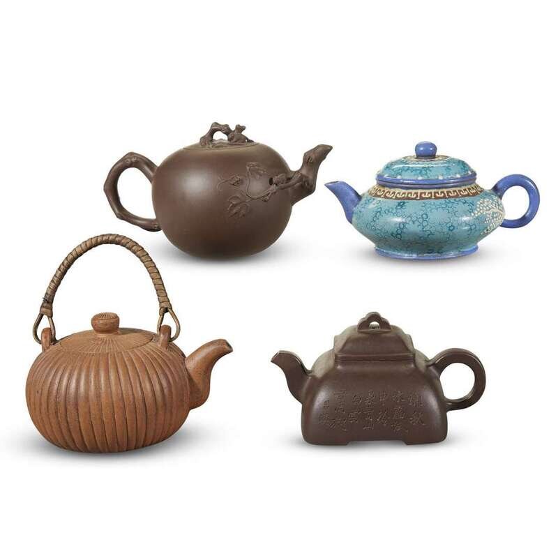 Comprising: a spherical pot, finely potted, modelled with branch-form handle and spout, squirrels and grapes, underside with impressed seal; one of ribbed globular form with wicker swing handle, underside of cover with stamped mark, underside with boldly-incised "Ming Yuan", stamped seal "Wu(?) fu tang jianzhi"; square pot incised with poem, underside of cover and base with stamped seal; and an enameled teapot decorated with prunus branches and bamboo, stamped seal to underside.