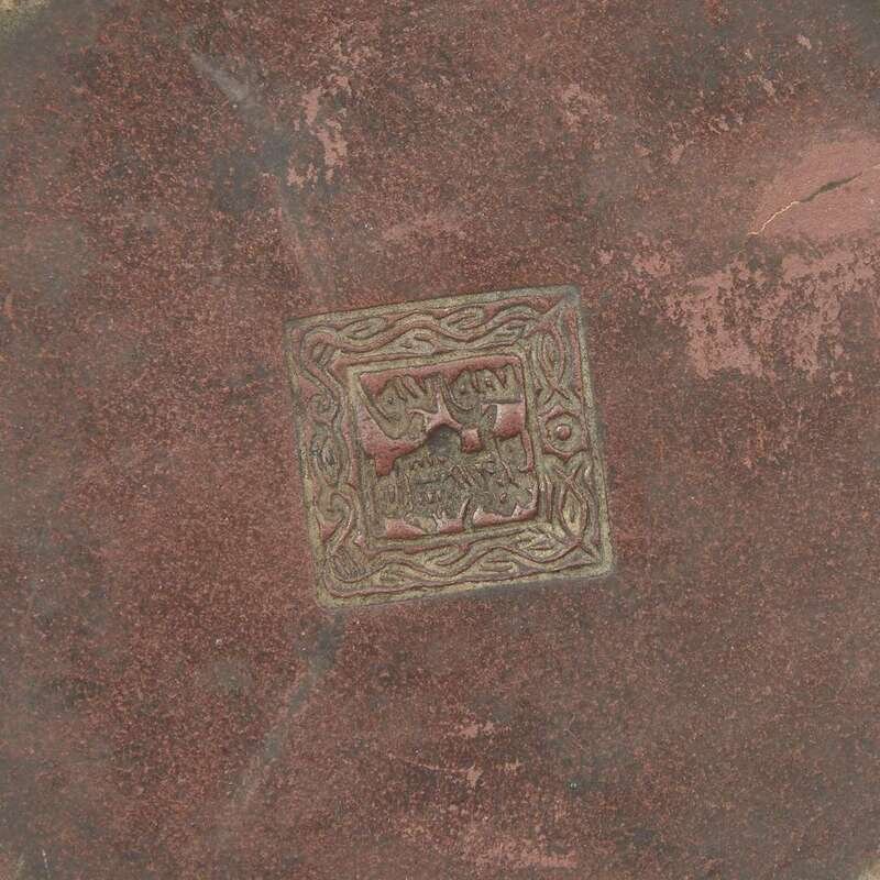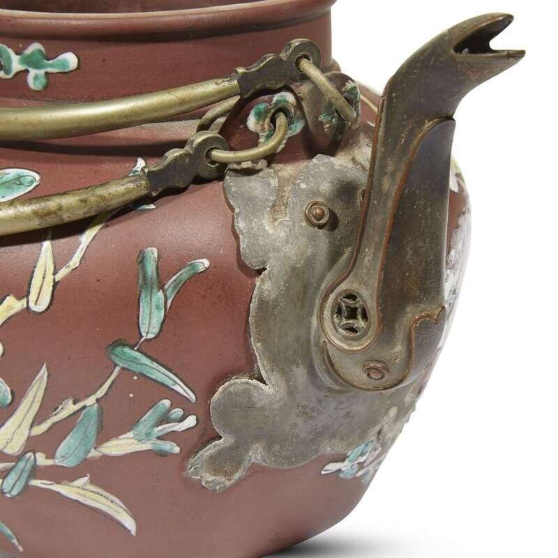 With seals to undersides and tops of covers, one with enameled decoration of heros and pierced metal spout with frog-form mount, all with wire handles.
