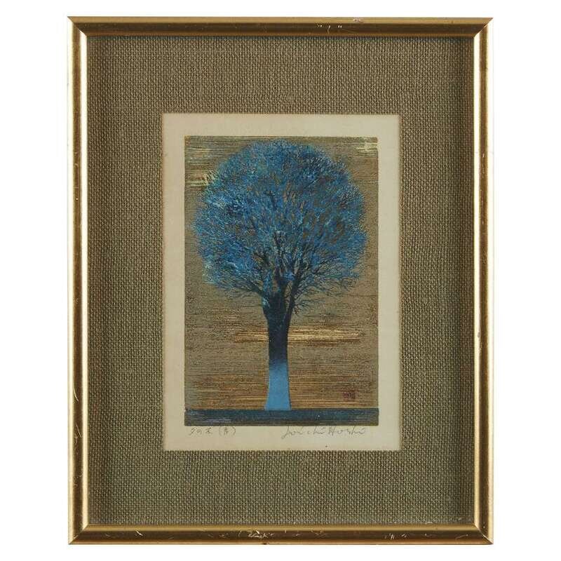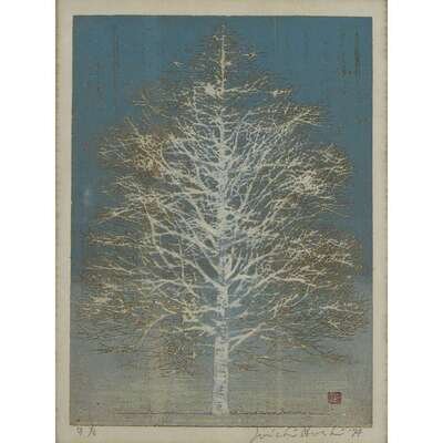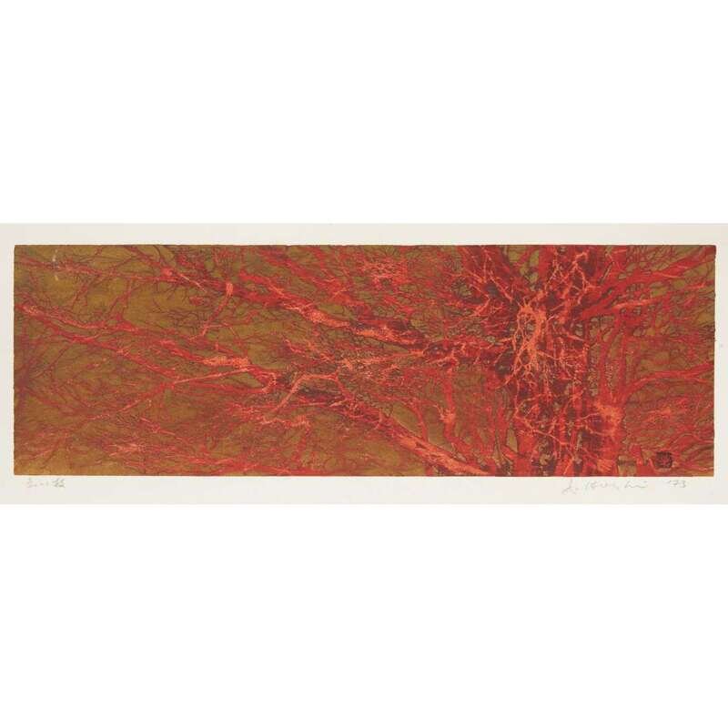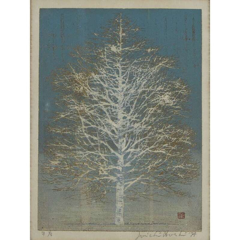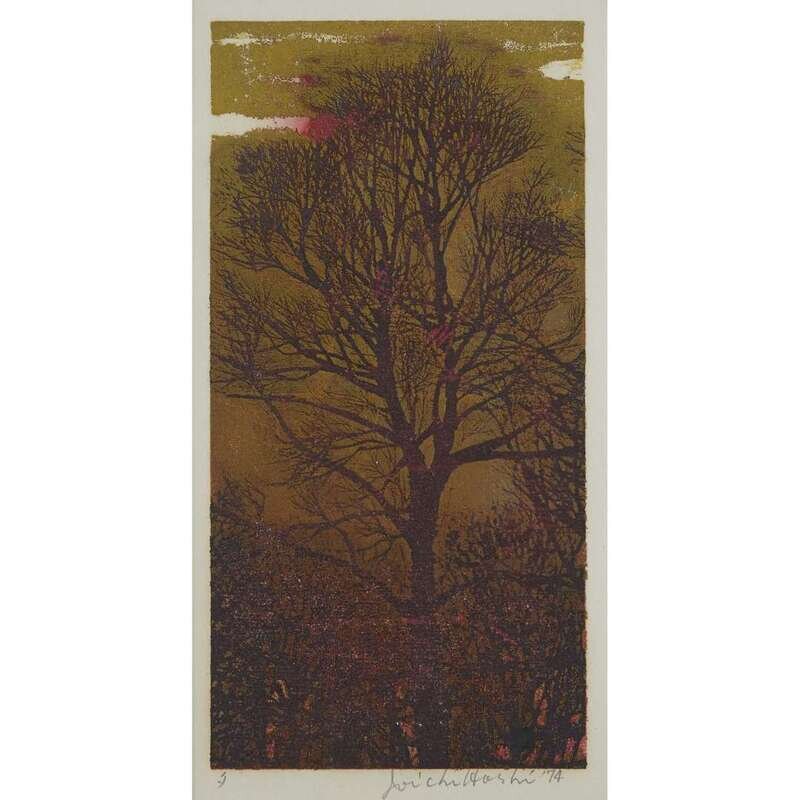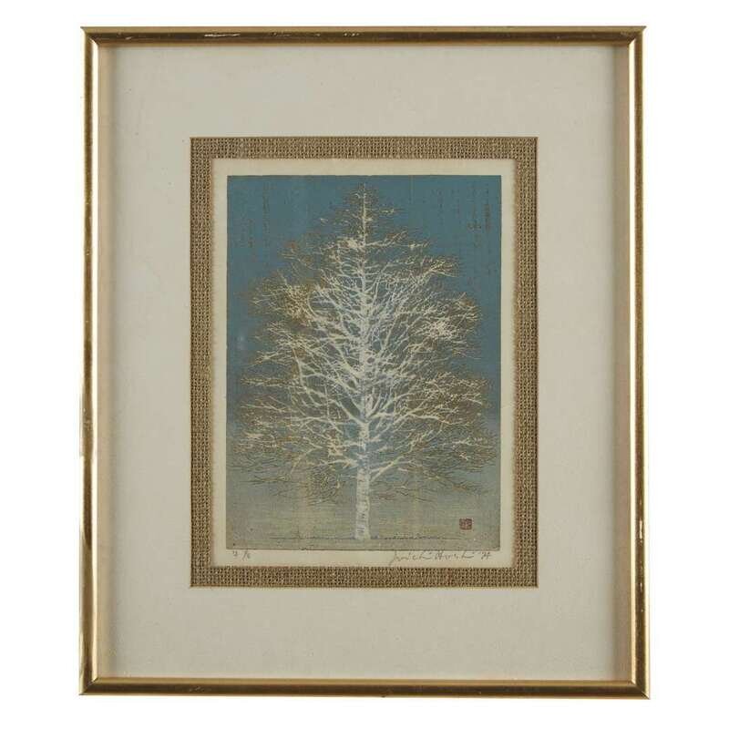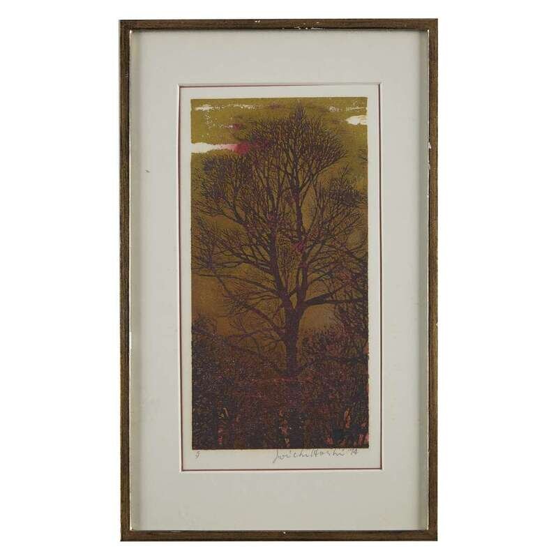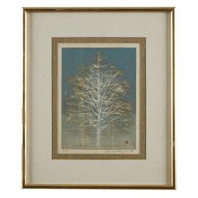 TREES, FOUR WOODBLOCK PRINTS Color woodblocks with metallic powders, all signed and inscribed, one dated 1973, two dated 1974; three framed, matted and glazed, one unframed.