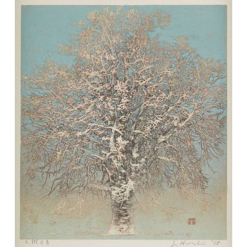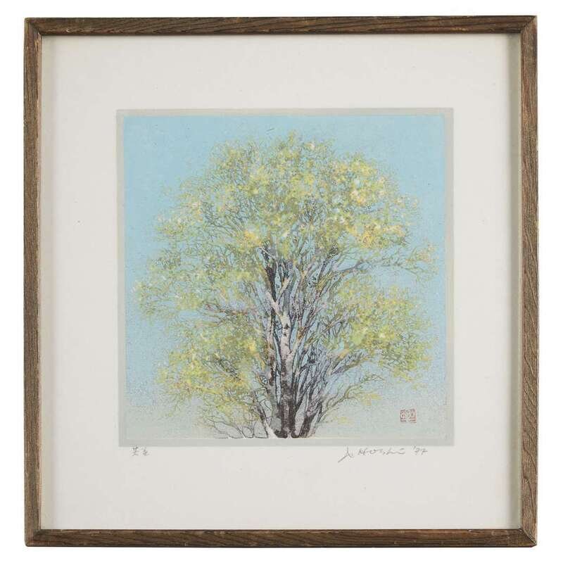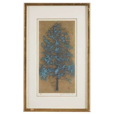 TREES, THREE WOODBLOCK PRINTS Color woodblock with metallic powder, all signed, dated, and inscribed; framed, matted, and glazed.