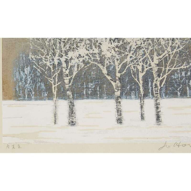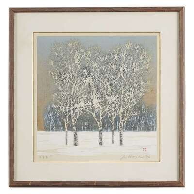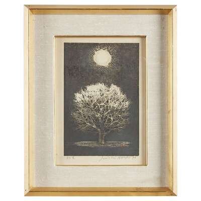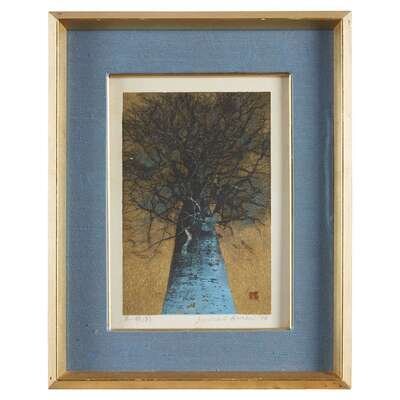 TREES, THREE WOODBLOCK PRINTS Color woodblocks with metallic color, all signed, dated, and inscribed; framed, matted, and glazed.