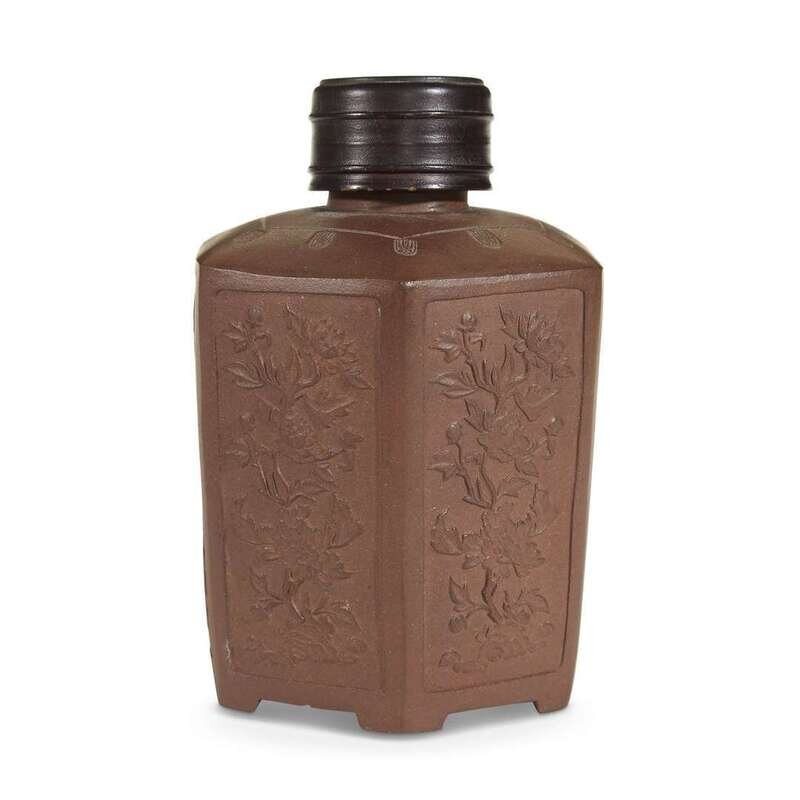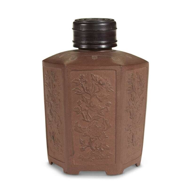 A Yixing stoneware molded hexagonal tea caddy with later turned wood cover qing dynasty