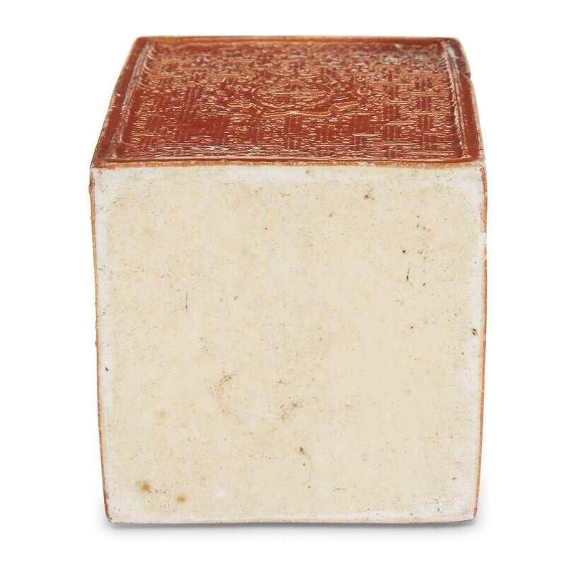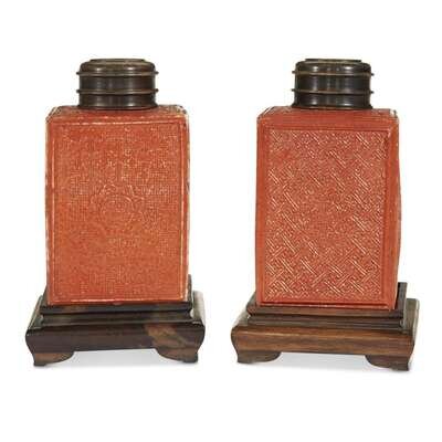 A pair of Chinese iron-red enameled molded porcelain tea caddies