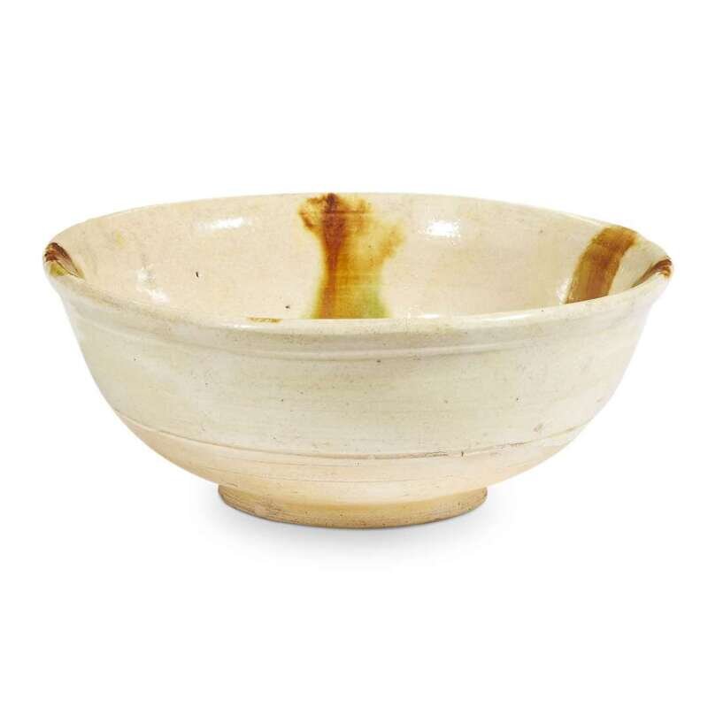 The cream-color bowl with splashes of amber-brown and green, pooling to brown in the well.