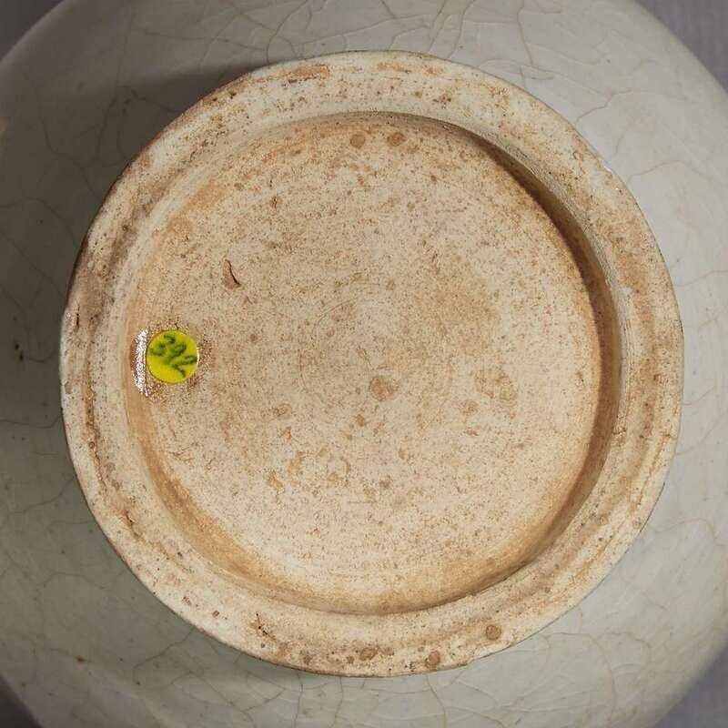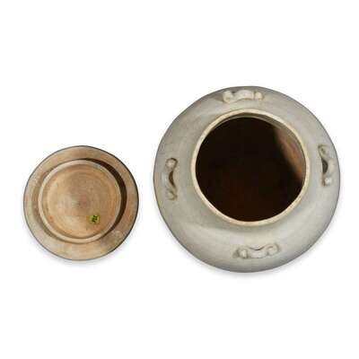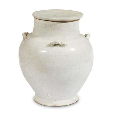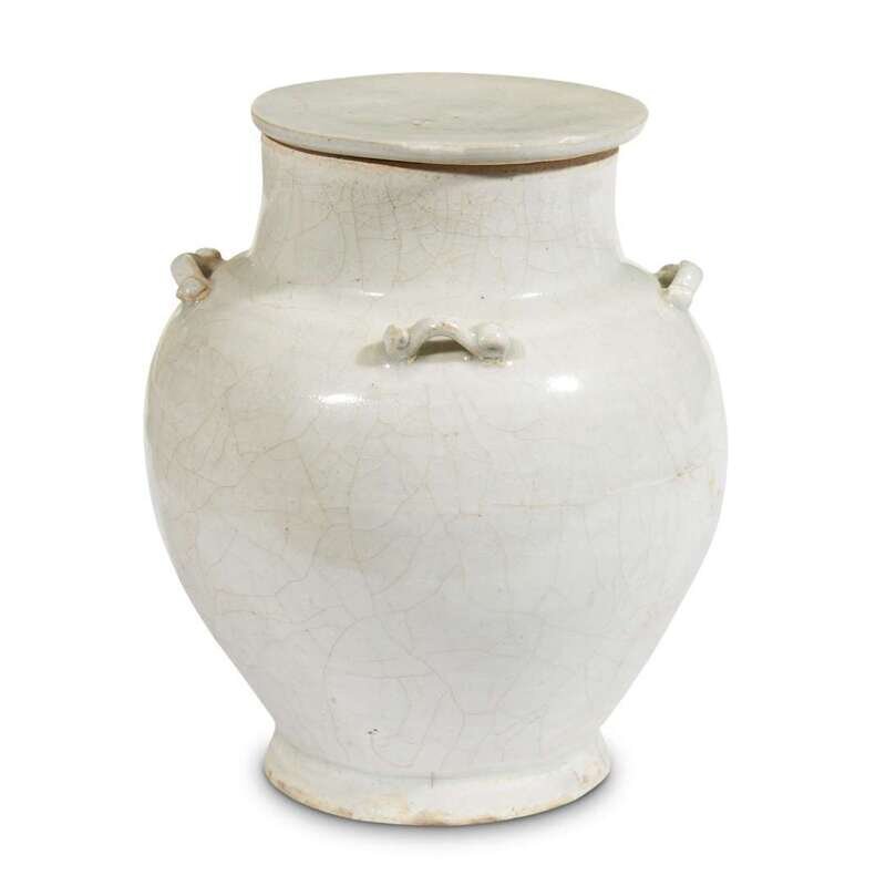 Of ovoid form with tall collar, low flared foot, four lug handles at the shoulder, flat flanged cover.