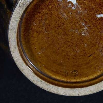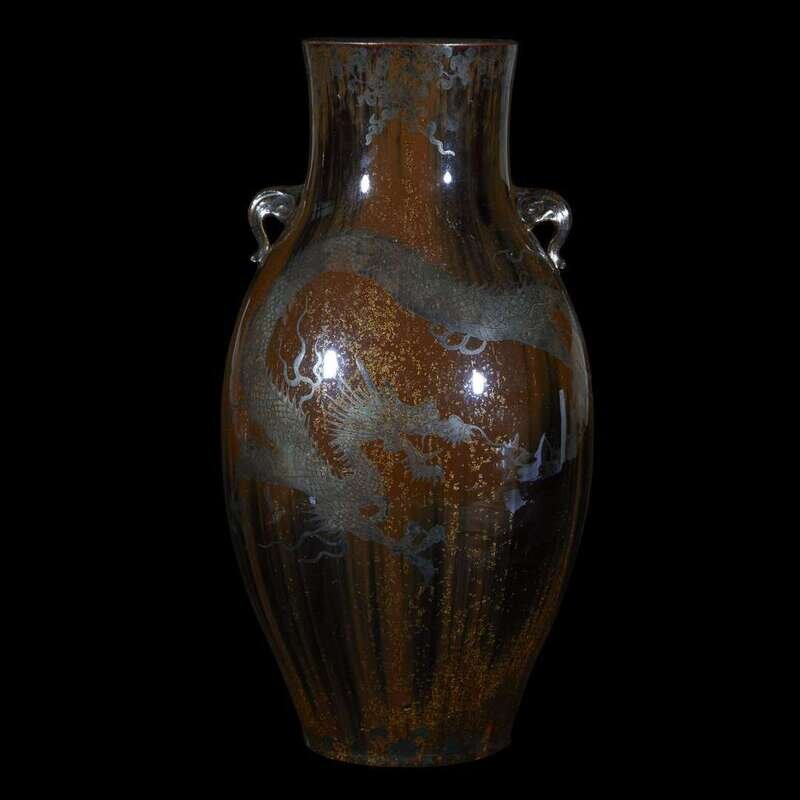 The vase attributed to Shozan, the silver to Shreeve & Co.; of ovoid form with scroll handles at the waisted shoulder, dragon decorations on a "cats-eye" type glaze, underside with impressed marks.