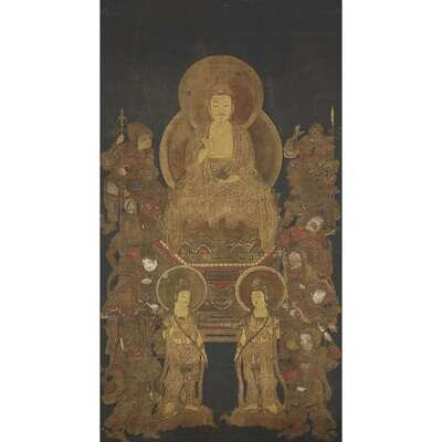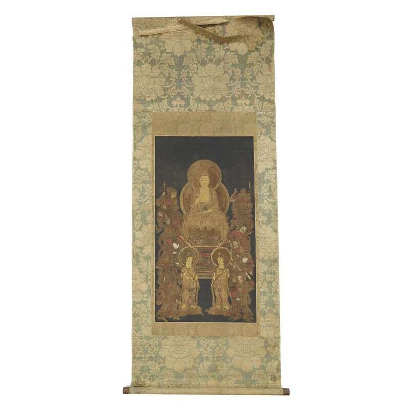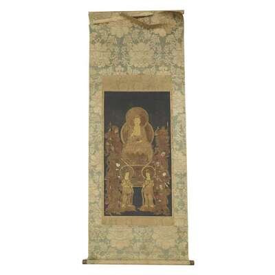 AMIDA ENTHRONED, WITH RETINUE ink, gofun and color with gold paint on silk, brocade mounts, mounted as a hanging scroll, with engraved copper roller caps, Japanese wood box.