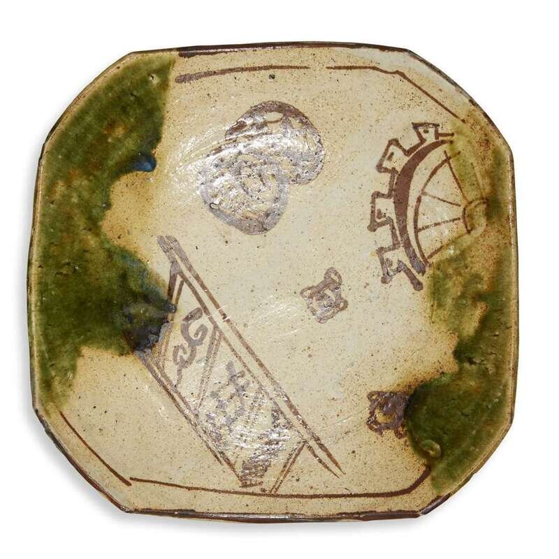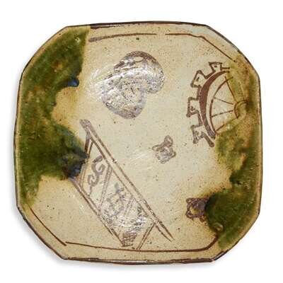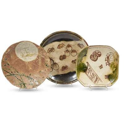 The largest, possibly 17th/18th century decorated with tama and clouds, with a lable to the underside reading "E & J FRANKEL COLLECTION, NO. 210"; the second, with angled corners, possibly Oribe-revival, 19th century or earlier, decorated with roundels and a waterwheel; the last with full moon and autumn grasses with incised mark to underside.