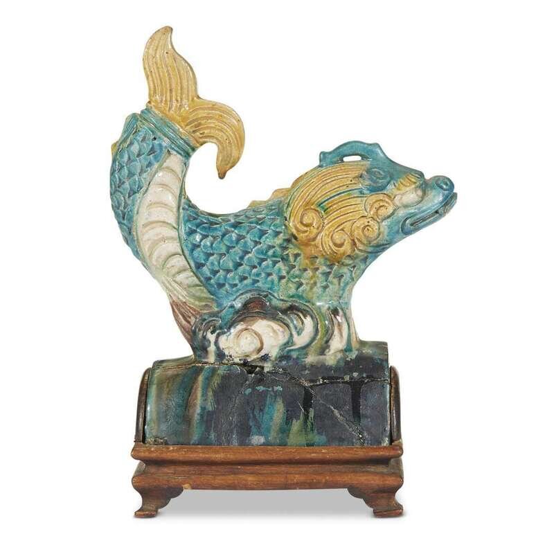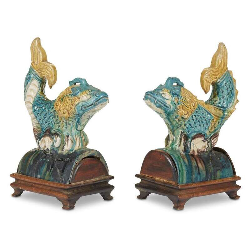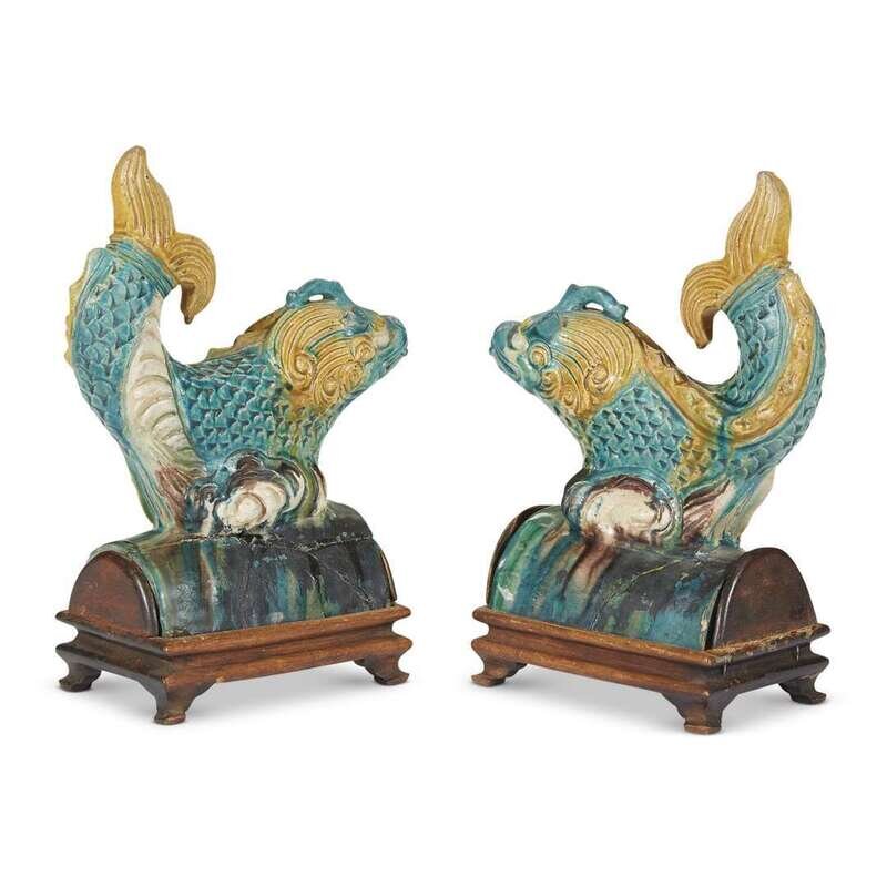 A pair of Chinese sancai-glazed pottery "Ao-Fish" roof tiles ming dynasty