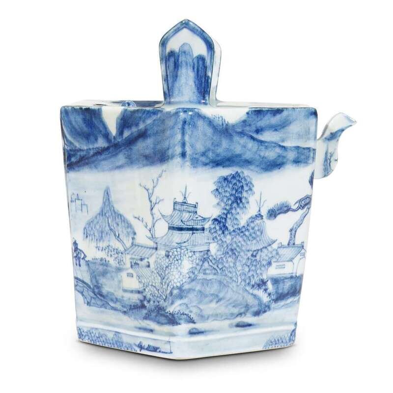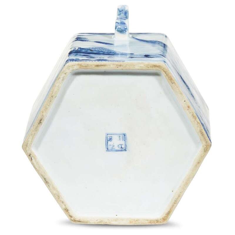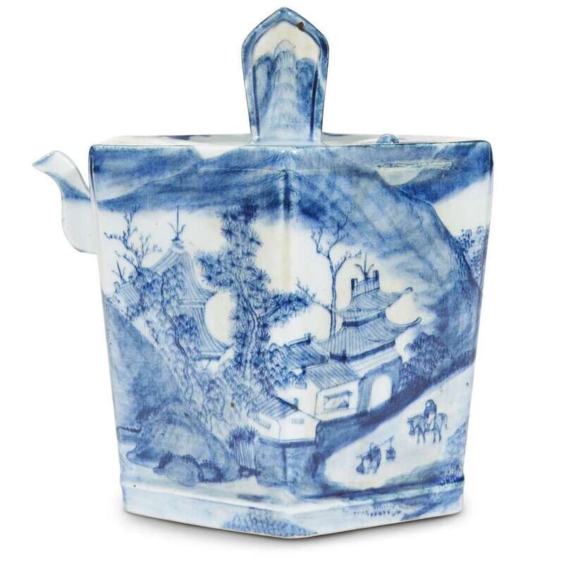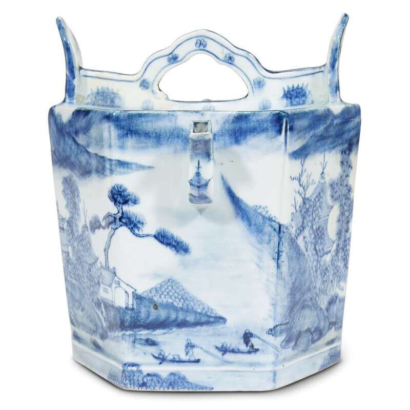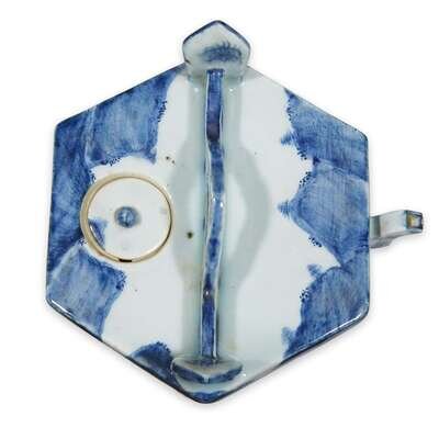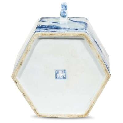Of hexagonal form, depicting scenes of a fishing village with figures on boats and on horseback, inscribed on underside.