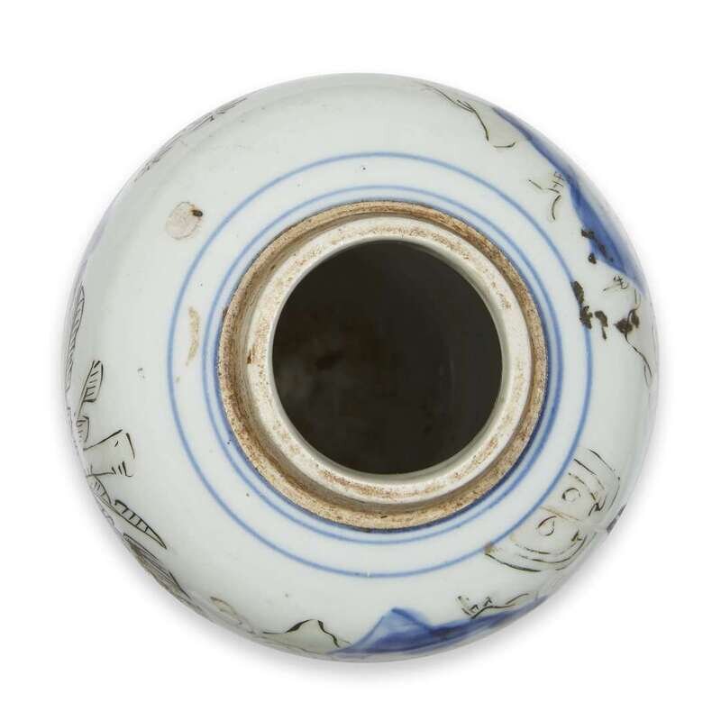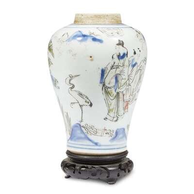A Chinese wucai-decorated porcelain "Sage and Crane" small jar late ming dynasty, 17th century