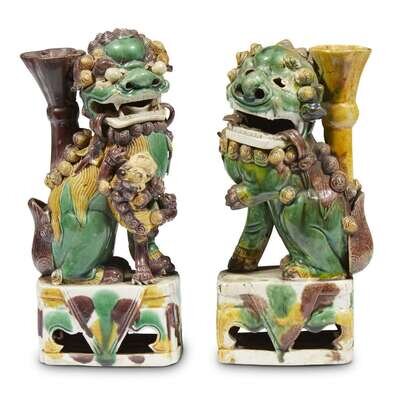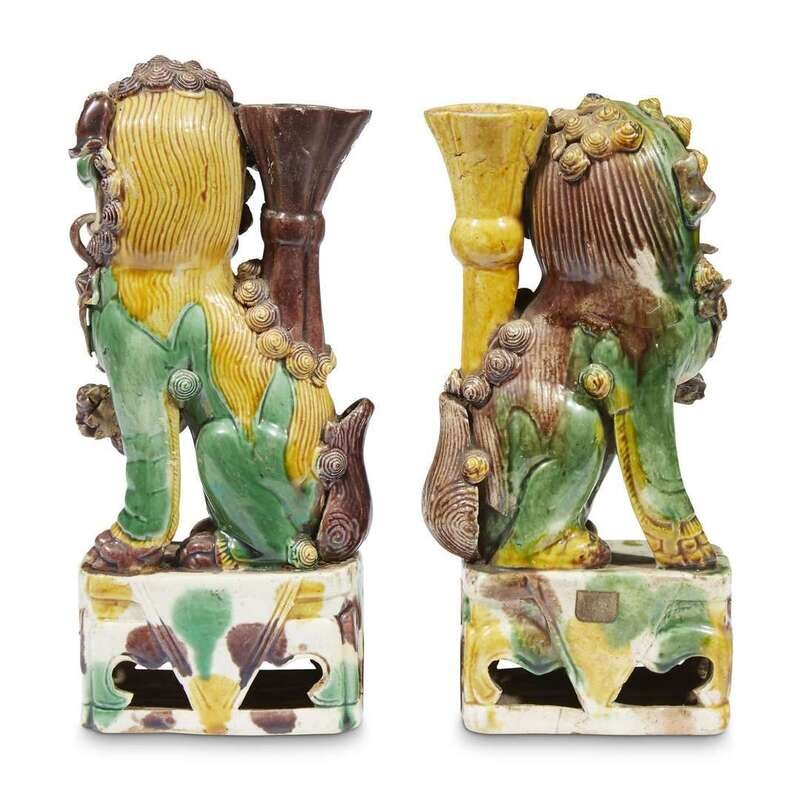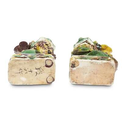 Two sancai-glazed buscuit porcelain Buddhist lion joss-stick holders possibly Kangxi period