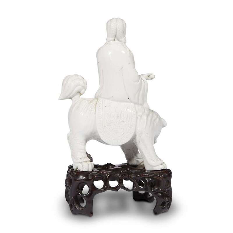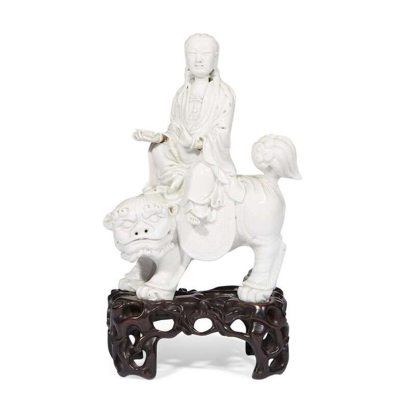 A Chinese blanc de Chine Figure of Guanyin seated on a Buddhist lion qing dynasty