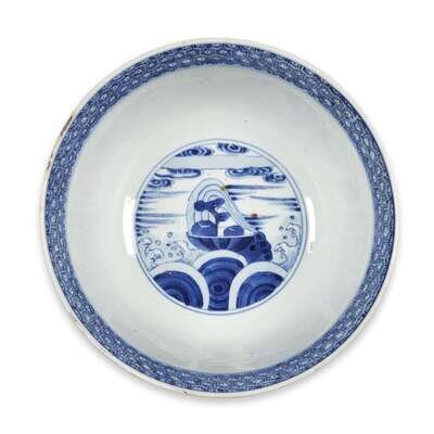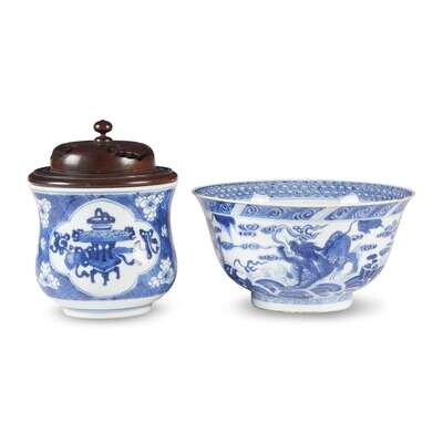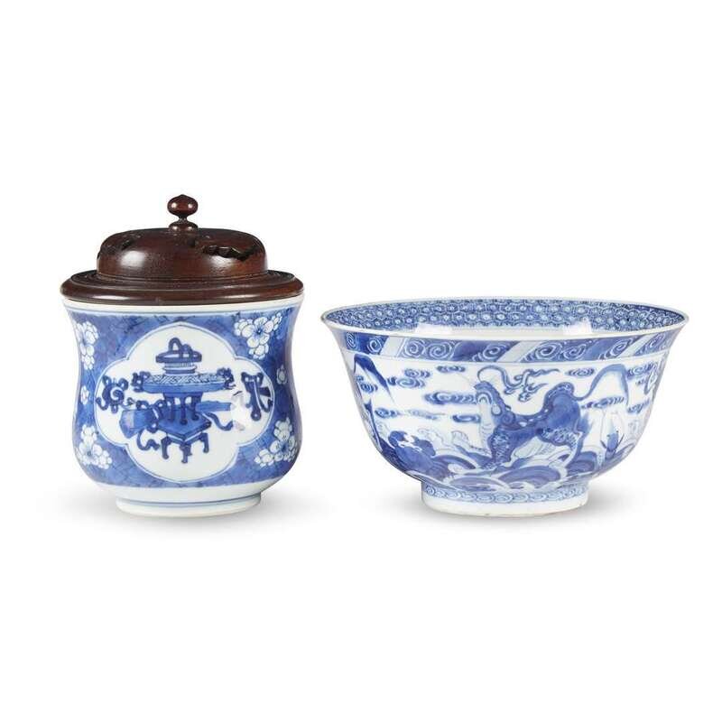 The first, a circular vessel with waisted sides, decorated with two shaped reserves, depicting "antiques", against prunus blossoms on "cracked ice" ground, later wood cover; the flared circular bowl decorated with four auspicious beasts on waves, the interior with a bowl of jewels and a lingzhi.