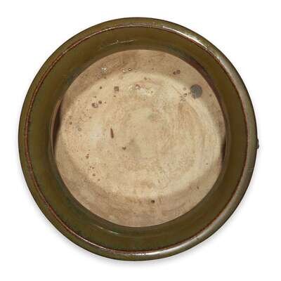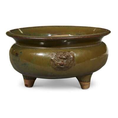 Circular with wide flared lip, lion masks at the shoulder, raised on three tapered feet.