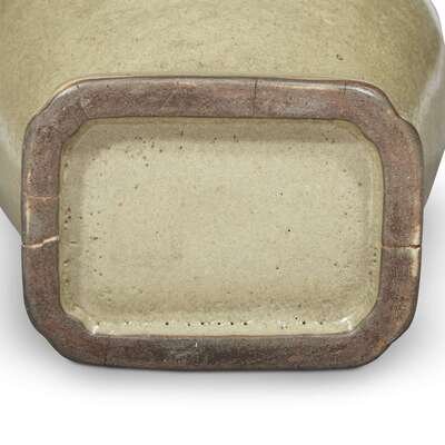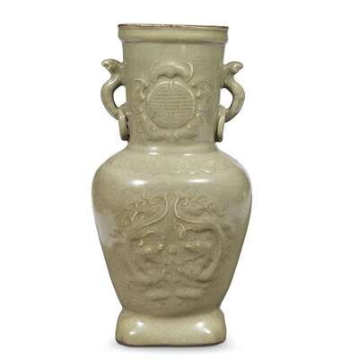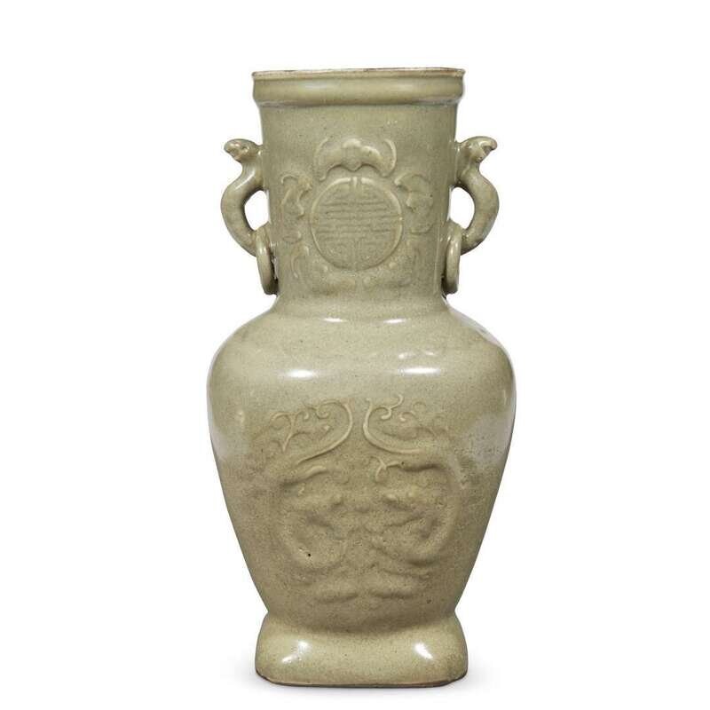 The neck decorated with wufu and Shou symbols, body decorated with scrolled dragons, with two small stylized loop and "ring" handles, underside of foot with dark brown dressing.