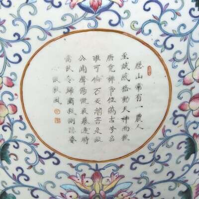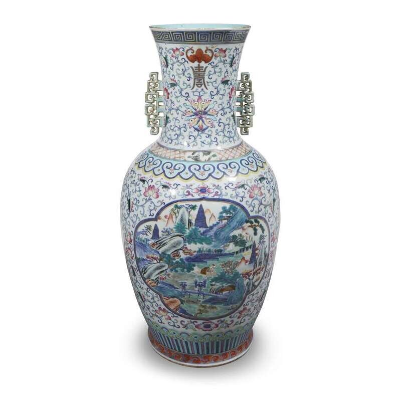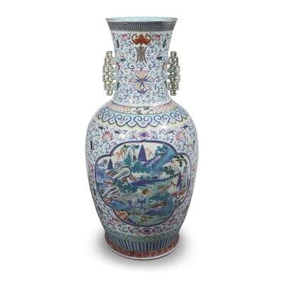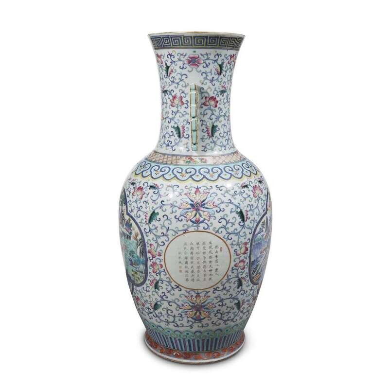 Of baluster form, with scroll handles, decorated with two panels of extensive landscapes and two calligraphy-inscribed roundels, against a lotus-scroll ground, ruyi lappets at the shoulder and base, key fret at the lip, scroll band at the edge of foot, interior of neck turquoise-glazed.