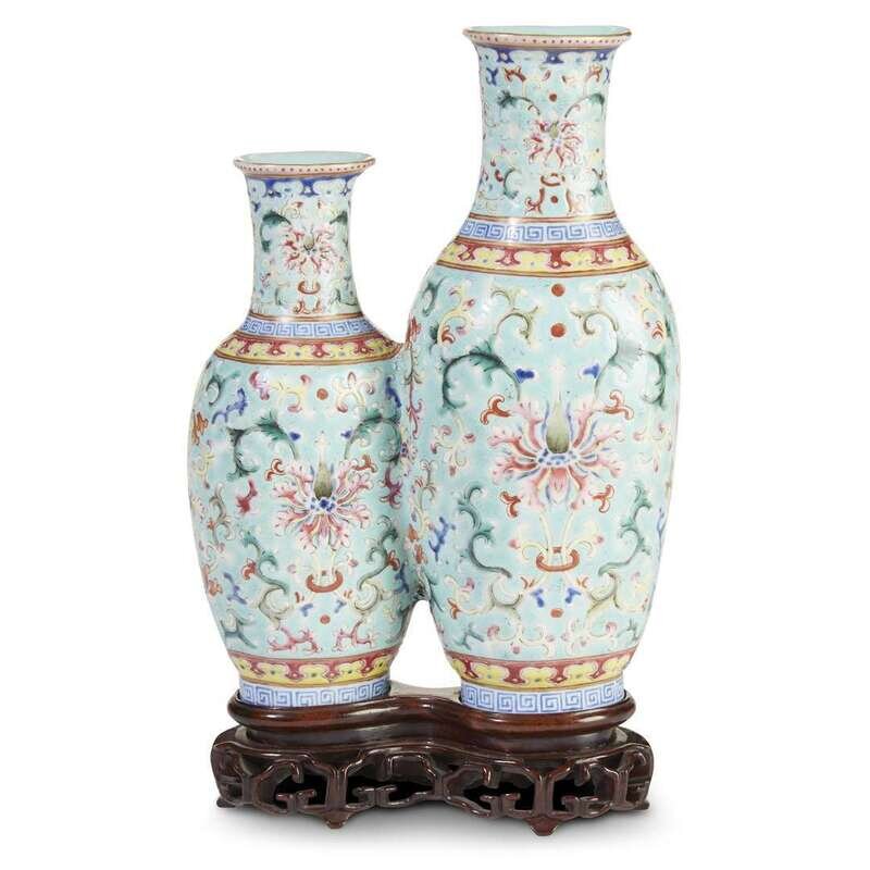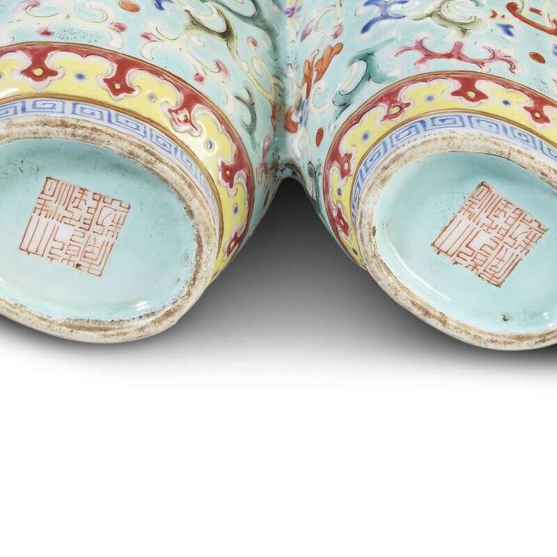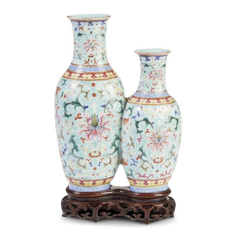 The conjoined bottles decorated with lotus scrolls on turquoise ground, underside of each with a seal, "Daqing Qianlong nian zhi".