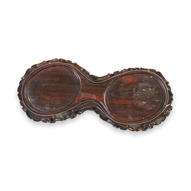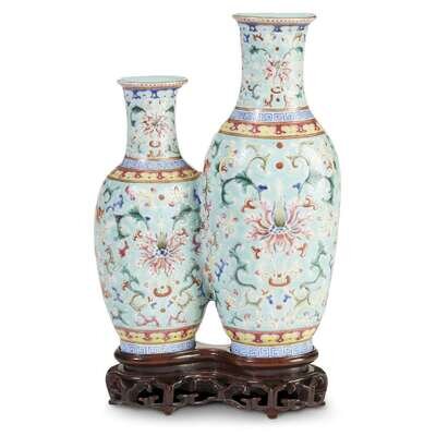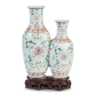 A Chinese famille rose-decorated porcelain double vase with carved hardwood stand qing dynasty, qianlong six-character mark