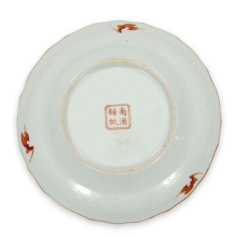 Interior depicting a landscape with gate, harbor and one poem, exterior with four bats and a seal writing "Nan Pu Gui Hang".