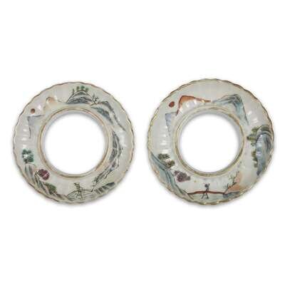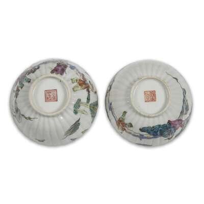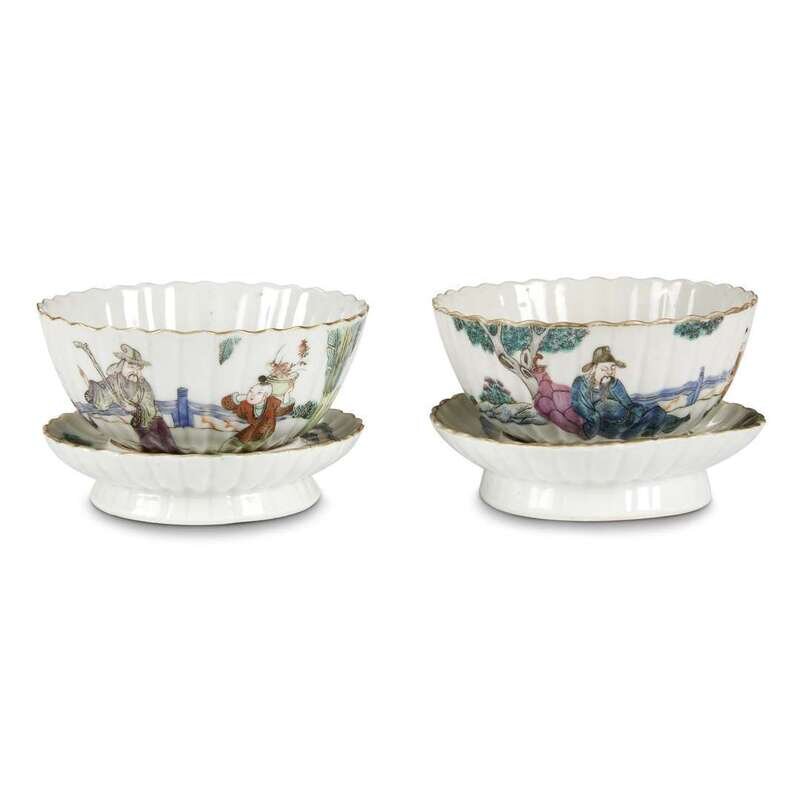 The bowls decorated with sages and poets with attendants, the stands with landscapes, underside of bowls with seal mark "Tongzhi Nianzhi".
