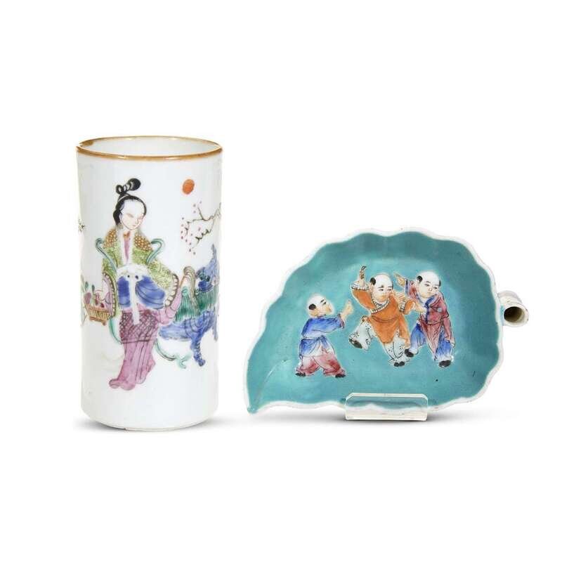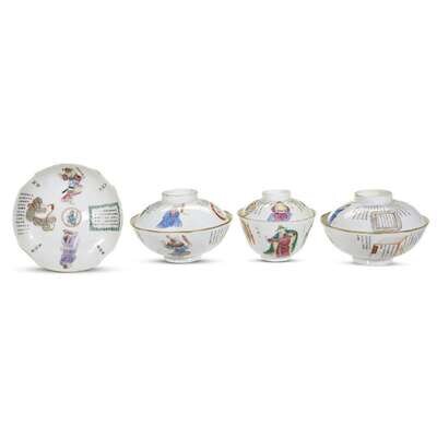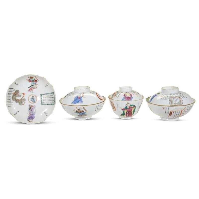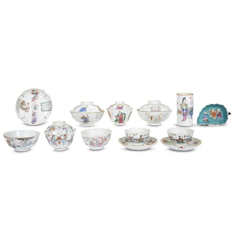 Three various covered bowls and a dish, decorated with calligraphy and "Heroes", undersides of dish and two larger bowls and covers with Daoguang seal marks; a leaf-shaped "boys" dish, underside with apocryphal Qianlong mark; a small cylindrical brushpot, underside with Daoguang seal mark; a small bowl and associated cover, and a similar small bowl, bowls with Tongzhi mark; a pair of fluted teabowls and saucers, undersides of saucers with Daoguang marks, seal marks to undersides of teabowls; and a similar teabowl with seal mark to underside.