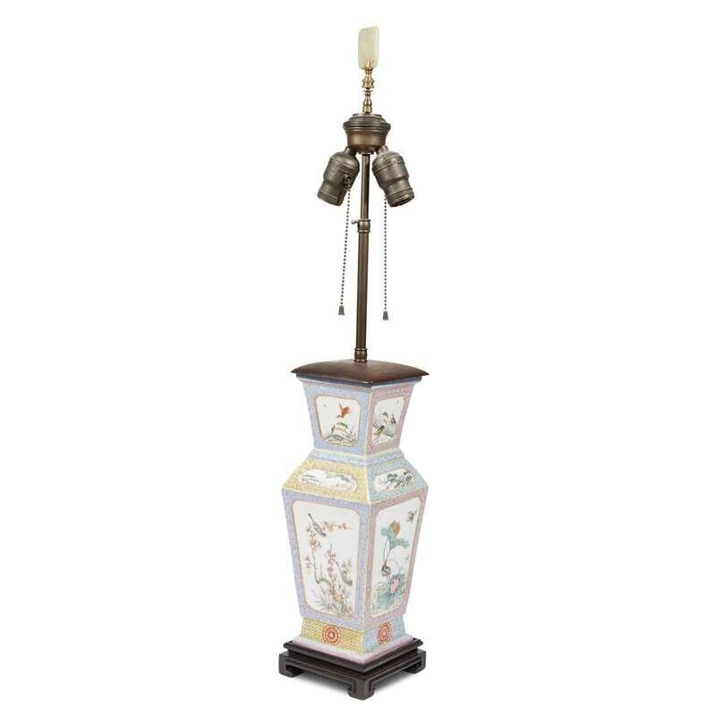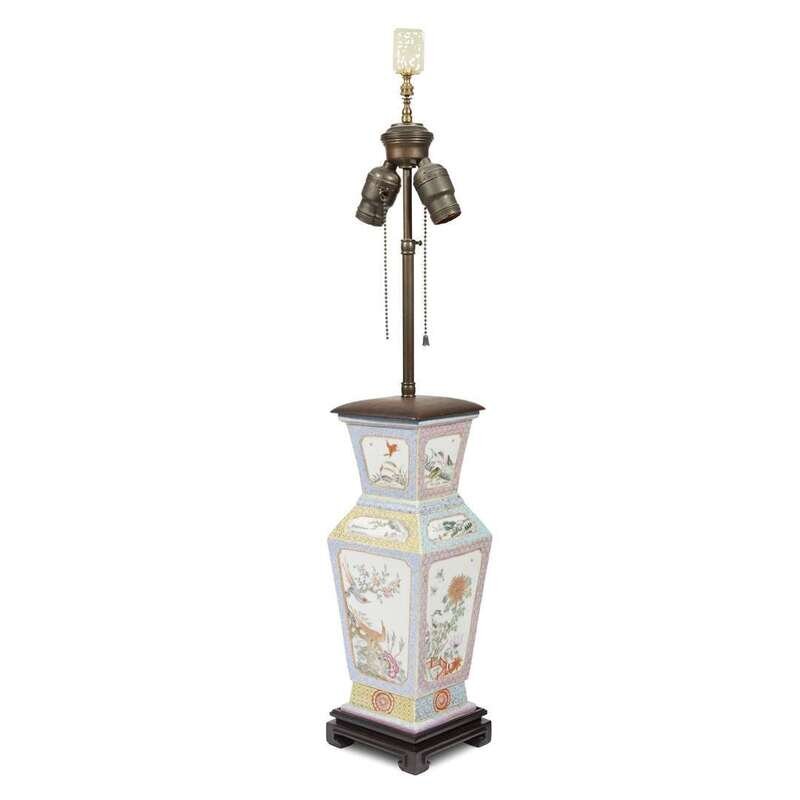 A Chinese famille rose-enameled porcelain vase, mounted as a lamp