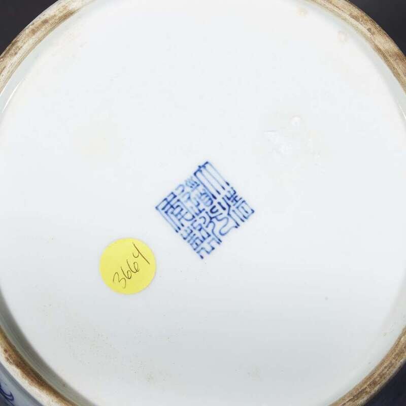 Depicting a three-clawed dragon chasing a flaming pearl through the clouds in underglaze blue with apochryphal "Daoguang" seal mark.